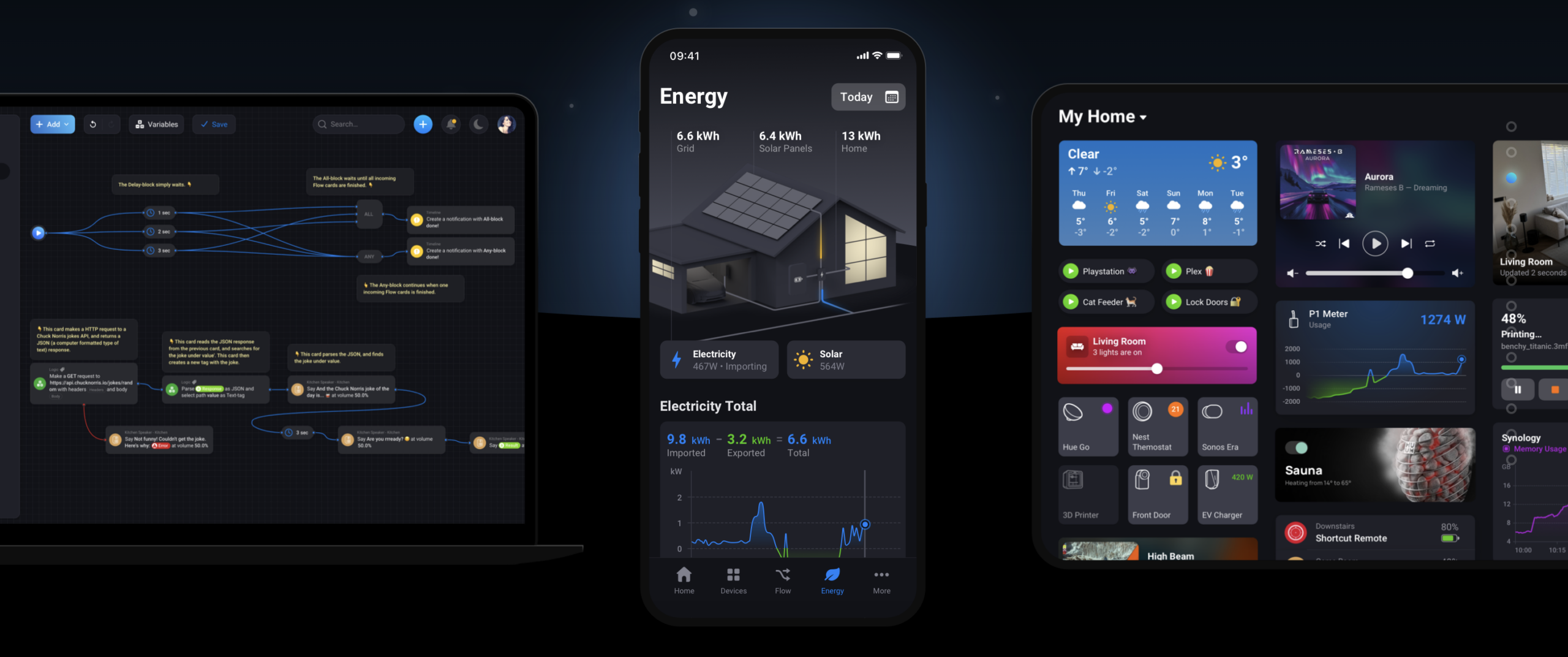| Homey OS Features | Advanced Flows, Energy, Dashboards, Insights, Homey App Store |