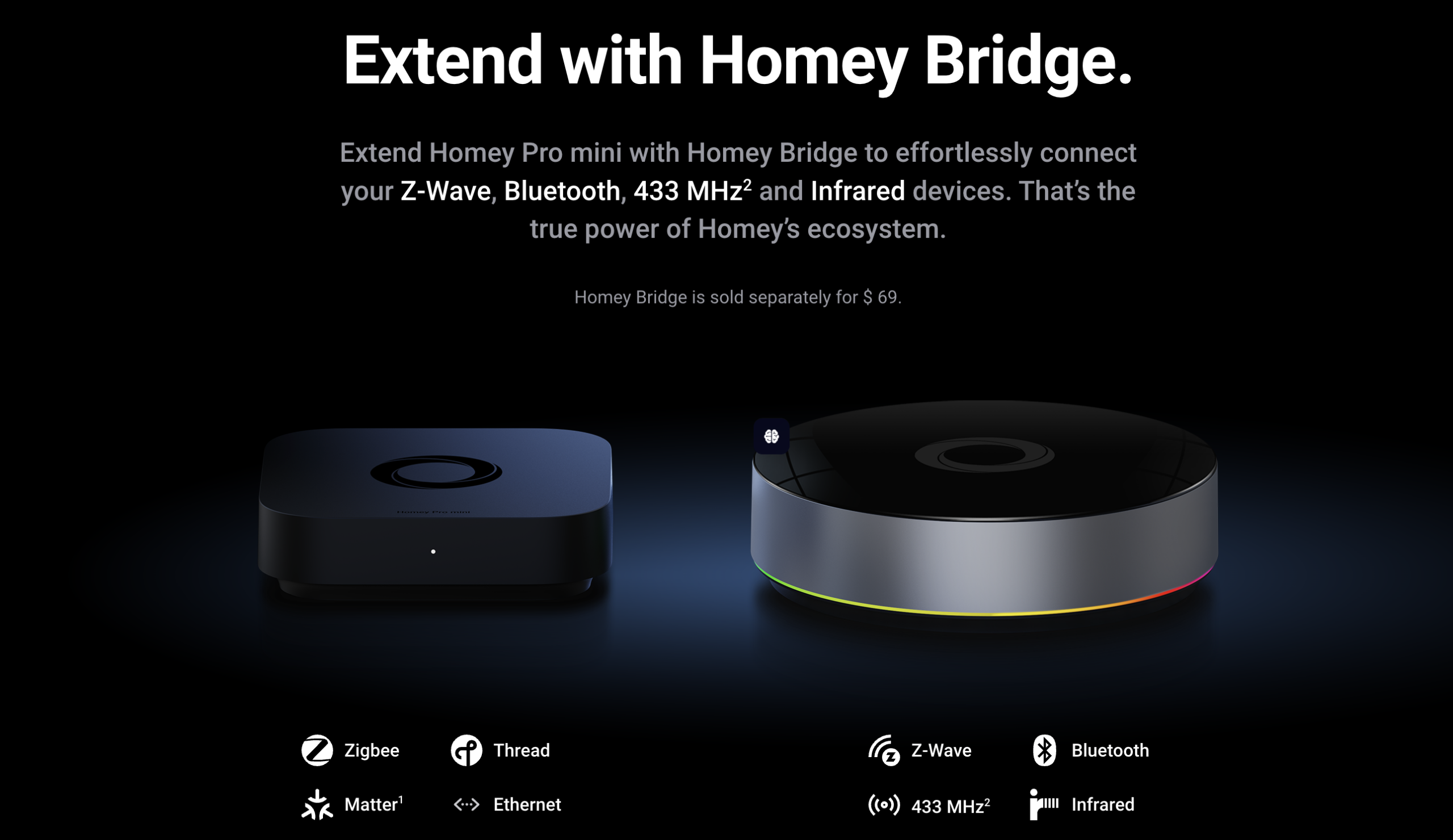 | Extendable With | Homey Bridge (adds Z-Wave, Bluetooth LE, 433 MHz, Infrared) |
