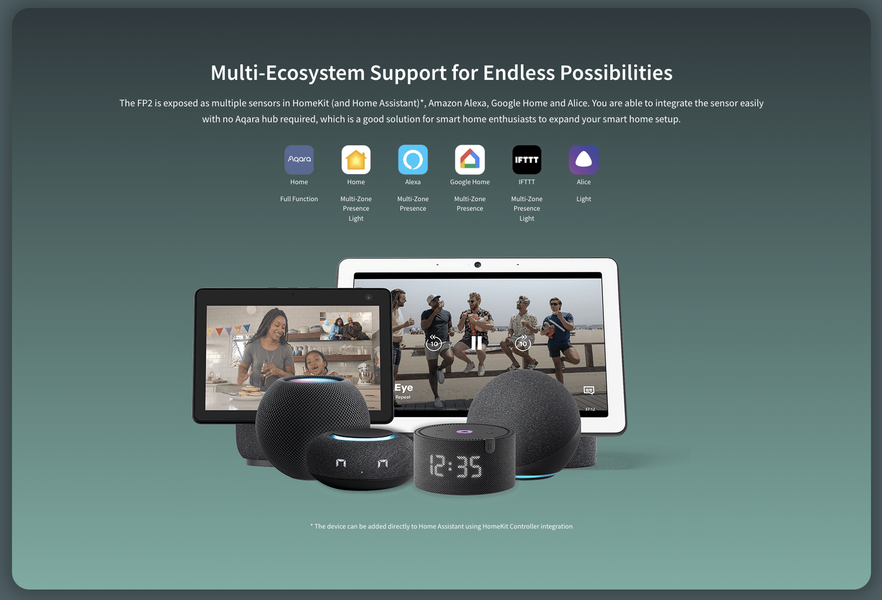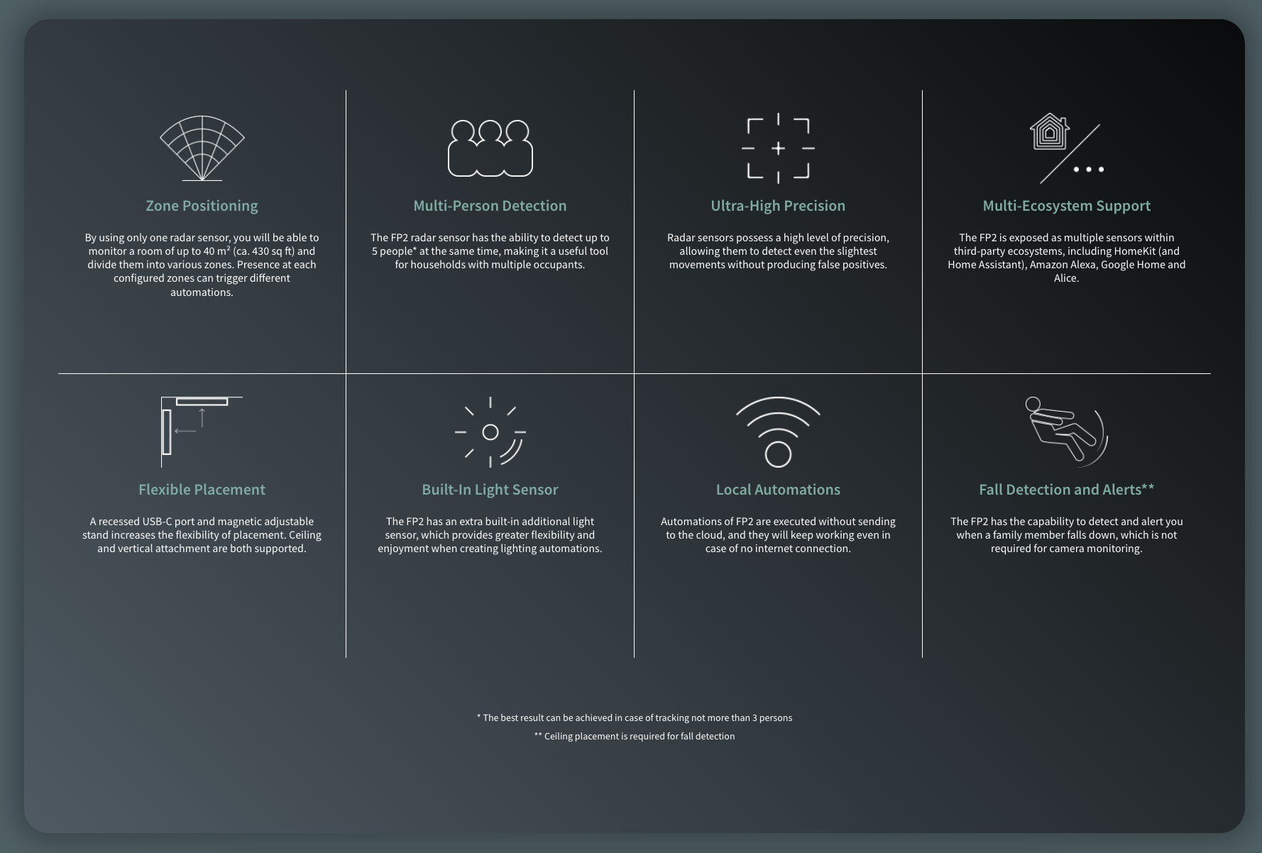 The Aqara Presence Sensor FP2 uses millimeter-wave radar to detect and track up to 5 people simultaneously with precise zone mapping. Features static presence detection, fall detection, and privacy-focused operation for comprehensive smart home automation.